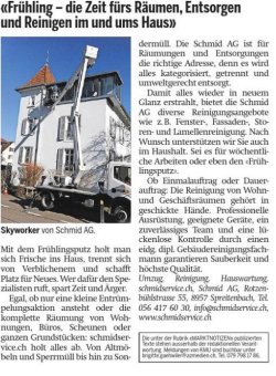 Damit alles wieder in neuem Glanz erstrahlt, bietet die Schmid AG diverse Reinigungsangebote wie z.B. Fenster-, Fassaden-, Storen- und Lamellenreinigung. Nach Wunsch unterstützen wir Sie auch im Haushalt. Sei es für wöchentliche Arbeiten oder eben den „Frühlingsputz“.